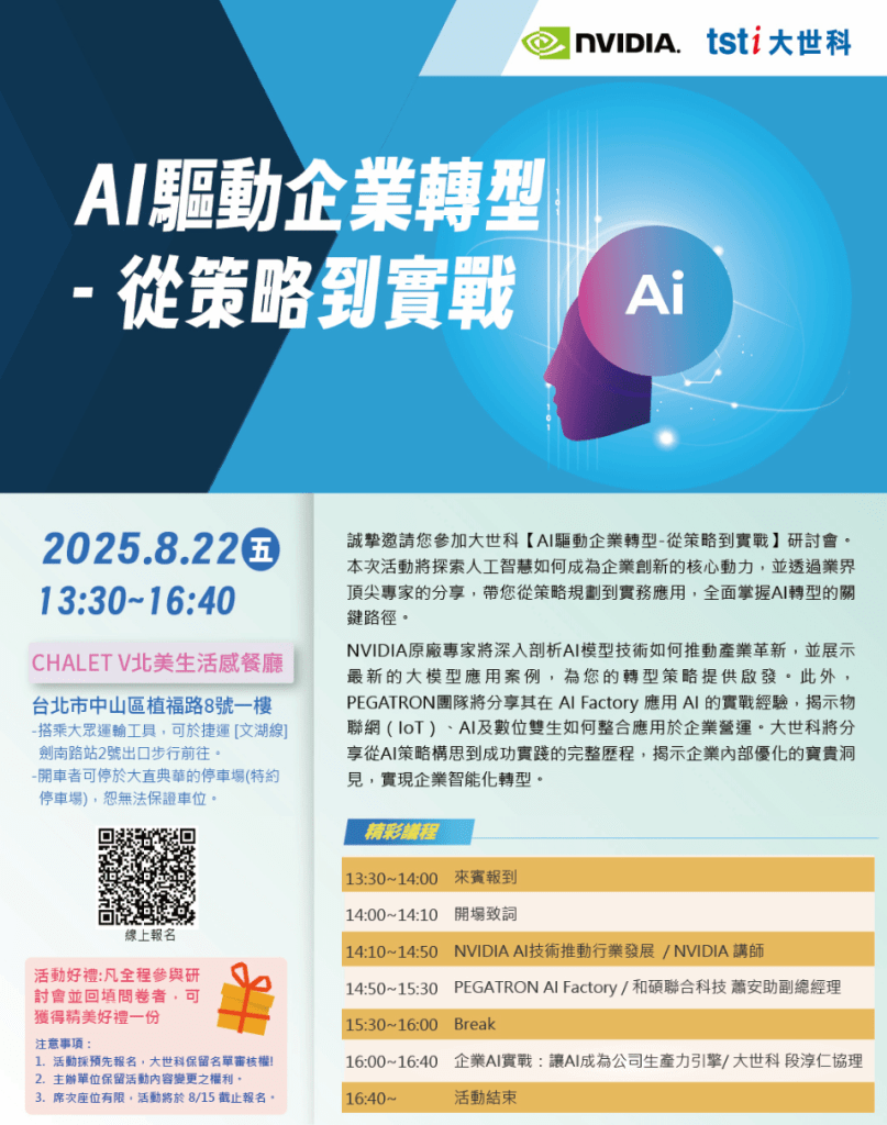 為了不被AI取代,所以學習使用AI,了解AI,探討人工智慧如何成為企業的核心動力,成為人的心競爭力。歡迎參加研討會